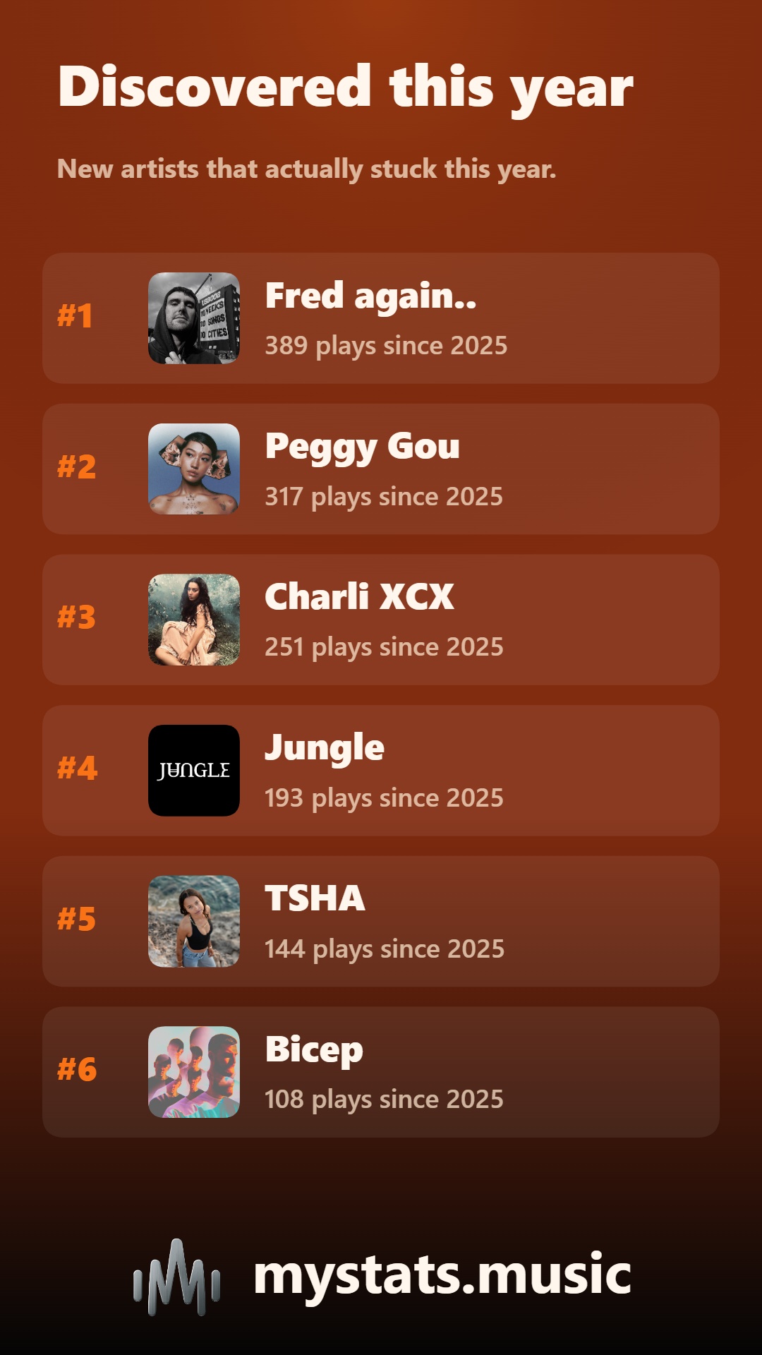 Time patterns, streaks, skip behavior, artist lifecycles, and more. mystats.music is designed for people who actually care about the details.